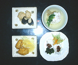 左上から、ウナギイヌの薩摩揚げ・お吸い物・フライ・ボタンウナギイヌの梅肉あえ